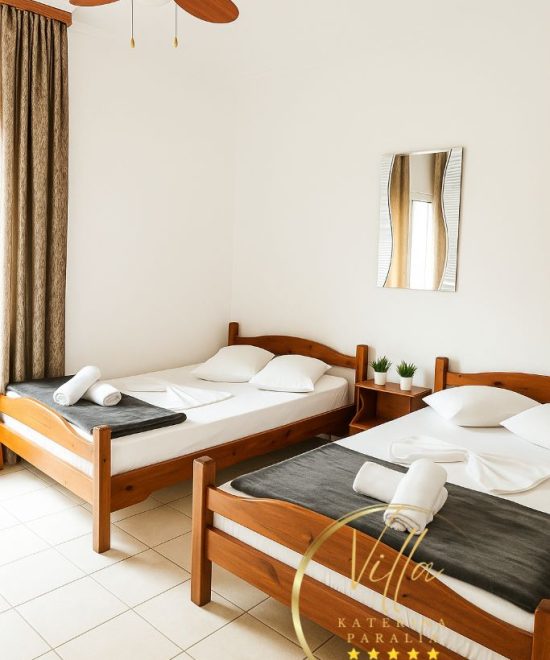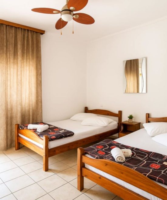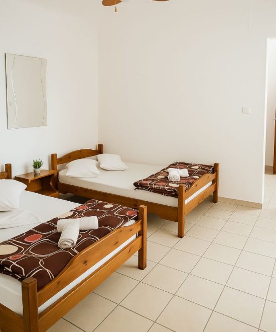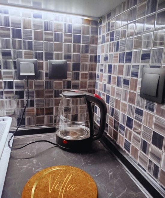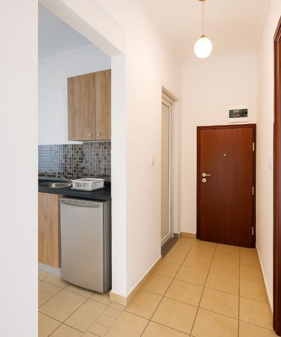 Студиото содржи два кревети.реновирана кујна (одвоена од спалната)со фрижидер и потребен прибор за готвење и јадење,реновирана бања со фен за коса и памучни крпи,два балкона од кои едниот е од страна на кујната а другиот од страна на спалната,тенда за заштита од сонце пред студиото,плафонски вентилатор кој ги задоволува потребите за разладување,клима инвертер уред и wi-fi.